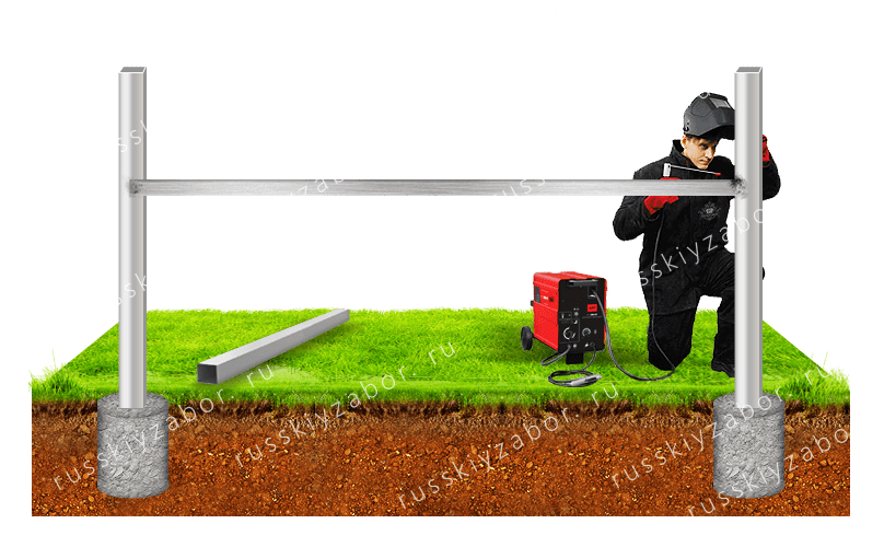 - Установка лаг. Лаги крепятся к столбам с помощью сварки, что обеспечивает дополнительную жесткость всей конструкции. Сварной каркас может быть на 2-х или на 3-х лагах. Обязательно нужно выполнить покраску всех элементов конструкции и мест сварки после окончания работ, благодаря этому внешний вид каркаса будет красивым, а места сварки будут защищены от коррозии и он сохранит прочность и устойчивость на долгие годы.